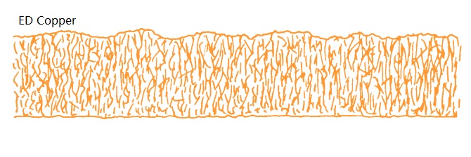 ED copper foil is produced through electrolytic deposition, the same process used for rigid PCB copper foils. One side of the foil is chemically treated to create a micro-rough surface, which improves bonding strength with dielectric substrates. Due to its vertical grain structure formed during electrolysis, ED copper has relatively low ductility and flex endurance. It is suitable for static-flex applications or fixed-installation FPCs that do not require repeated bending.